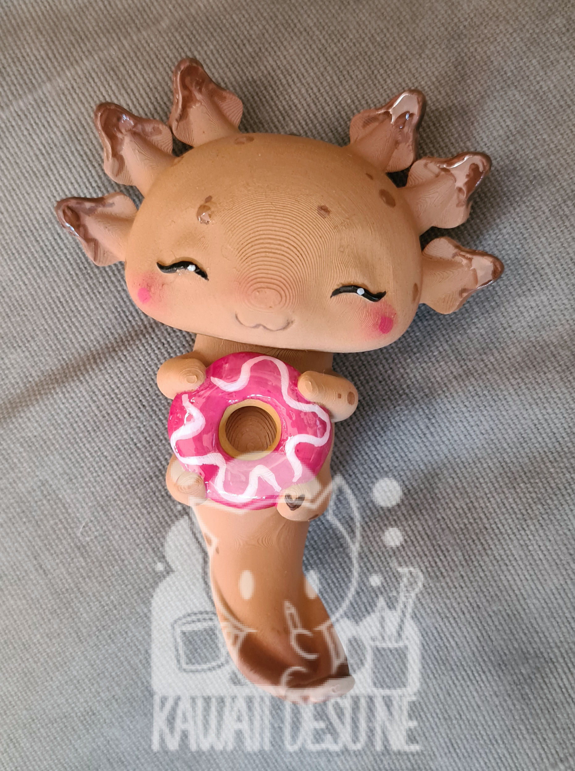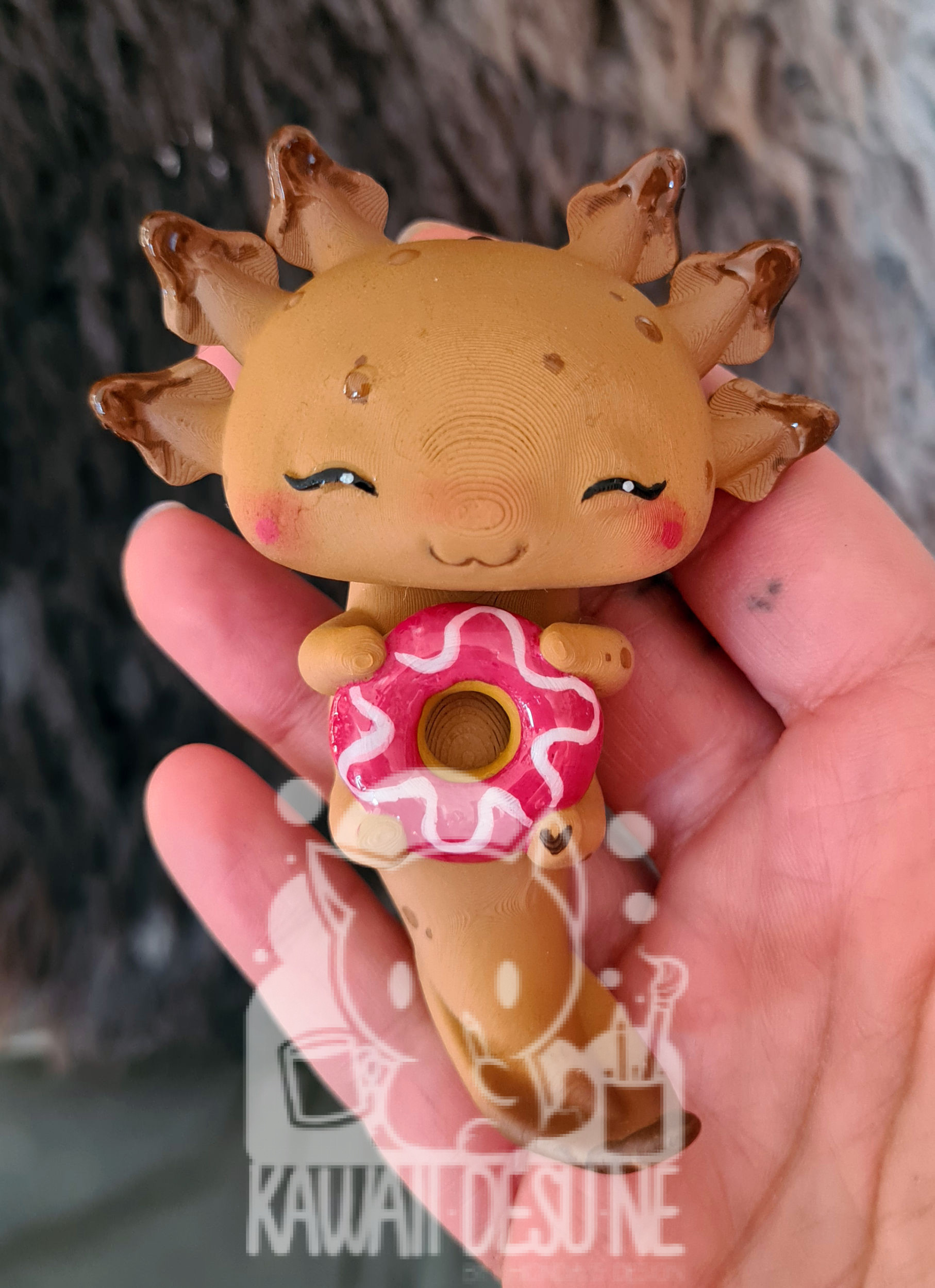 Nach dem Druck wurde das Axolotl bemalt, im Anschluss mehrfach mit UV Lack geschützt(lasst es aber trotzdem nicht dauerhaft in der Sonne sitzen!) und zum Schluss wurde die „Schokosoße“ wieder händisch mit Kunstharz auf das Axo „getropft“.