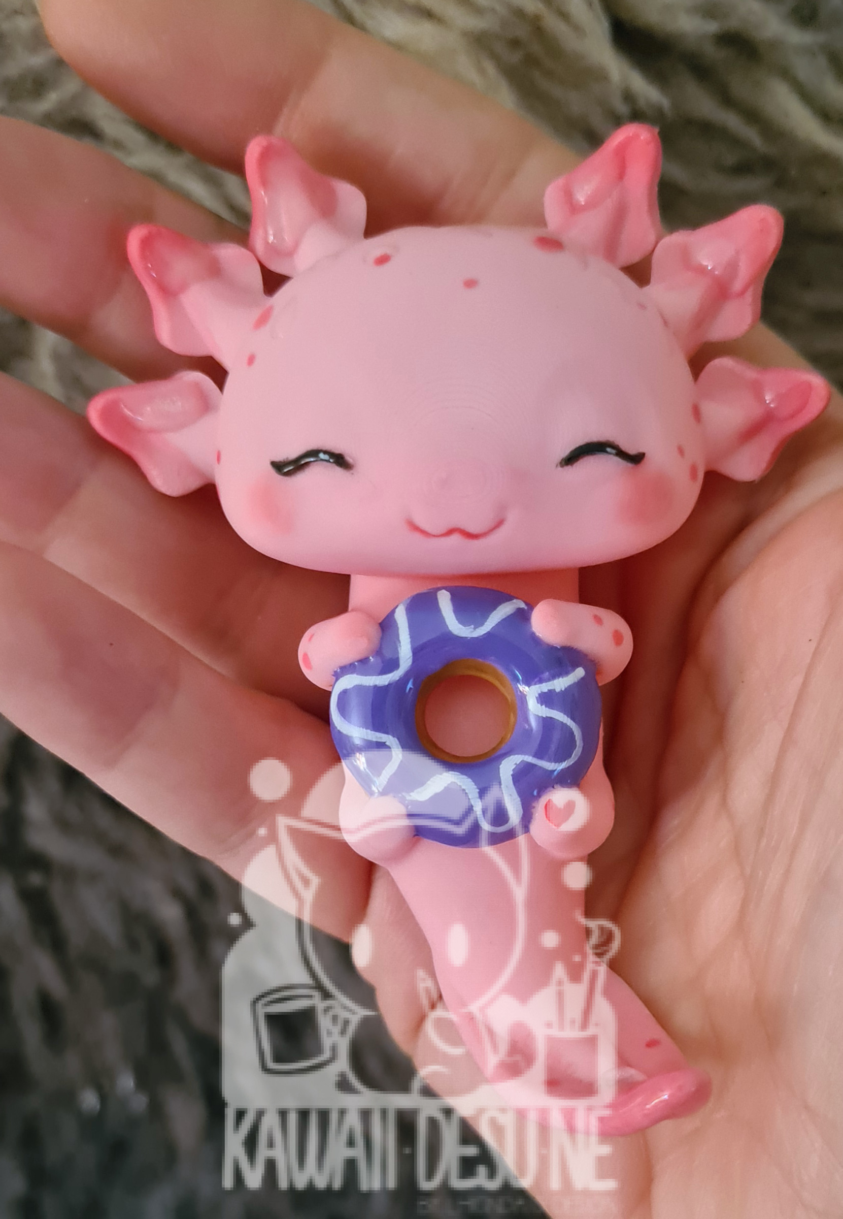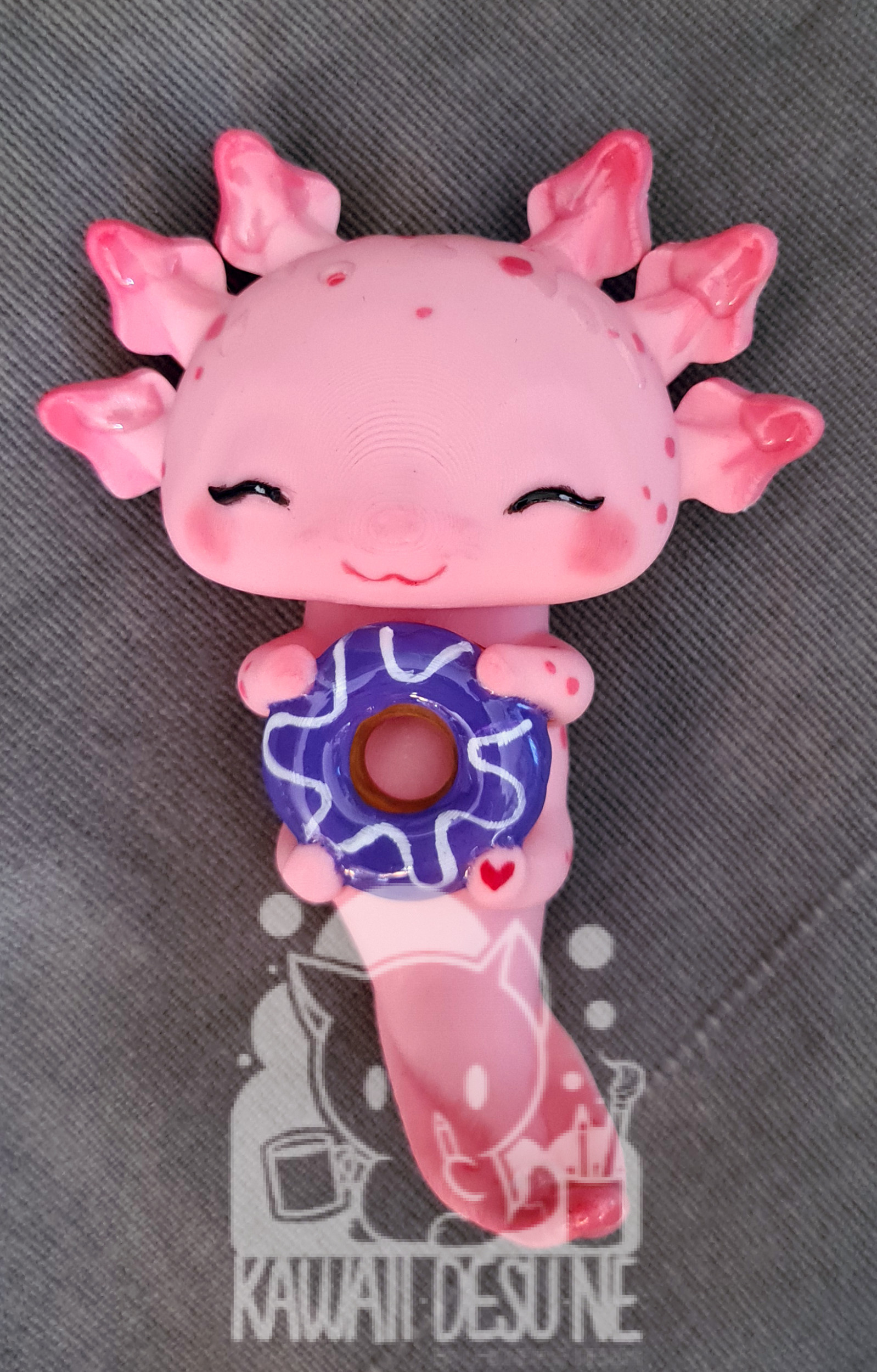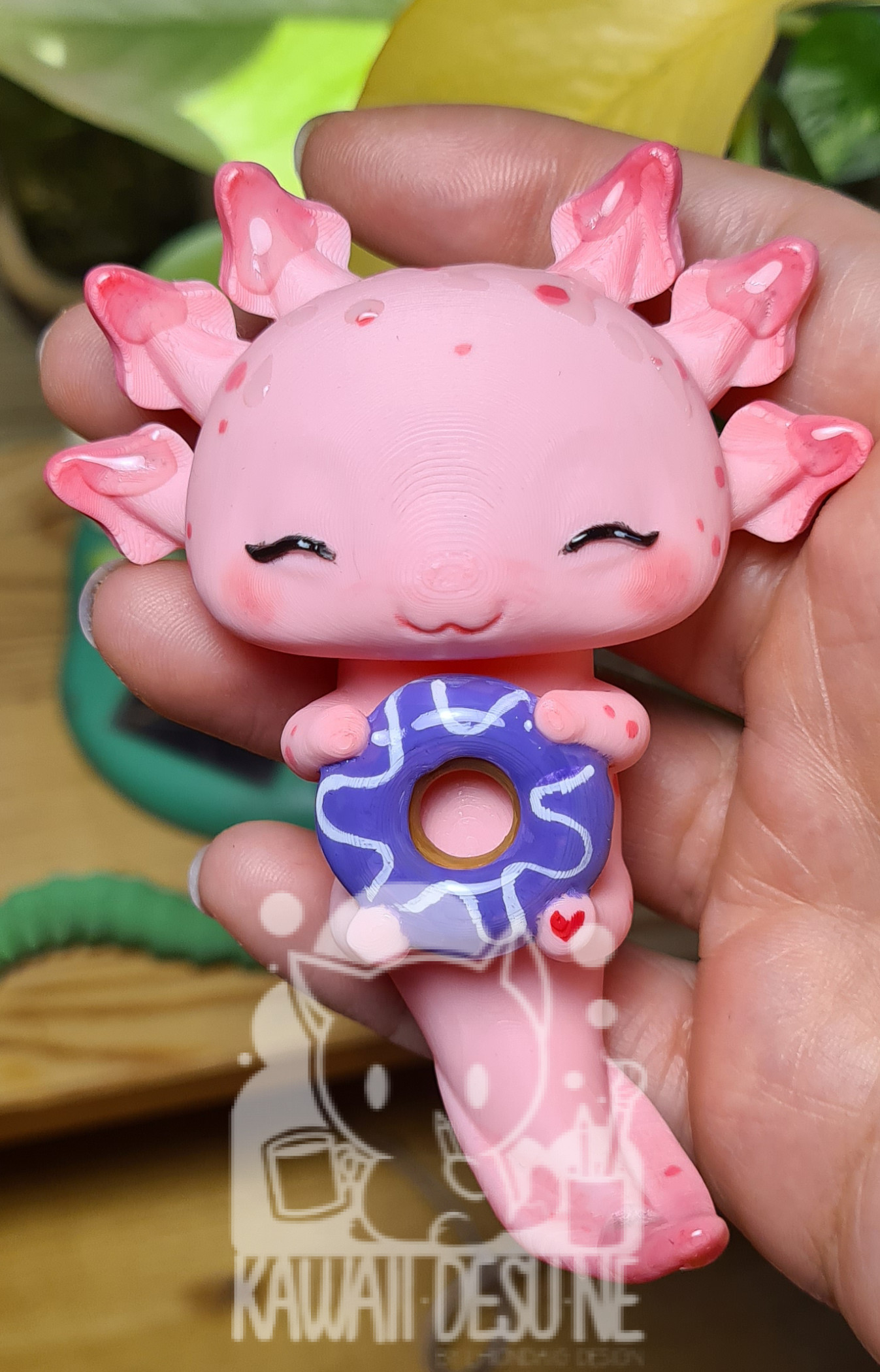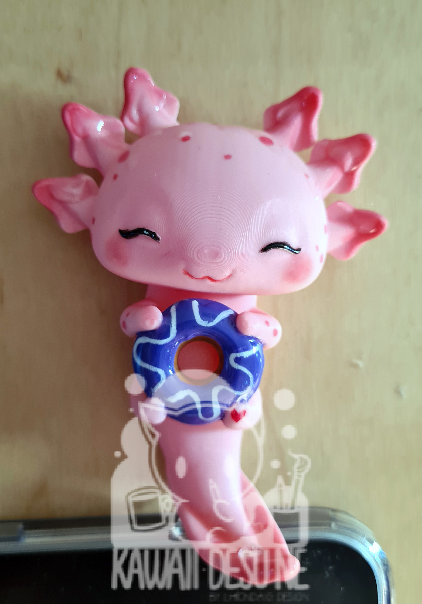 Nach dem Druck wurde jedes Axolotl einzeln per Hand mit durchsichtigem Kunstharz überzogen um oben genannte Rillen weniger sichtbar zu machen. Danach wurde es bemalt, im Anschluss mehrfach mit UV Lack geschützt(lasst es aber trotzdem nicht dauerhaft in der Sonne sitzen!) und zum Schluss wurde das „Wasser“ wieder händisch mit Kunstharz auf das Axo „getropft“.