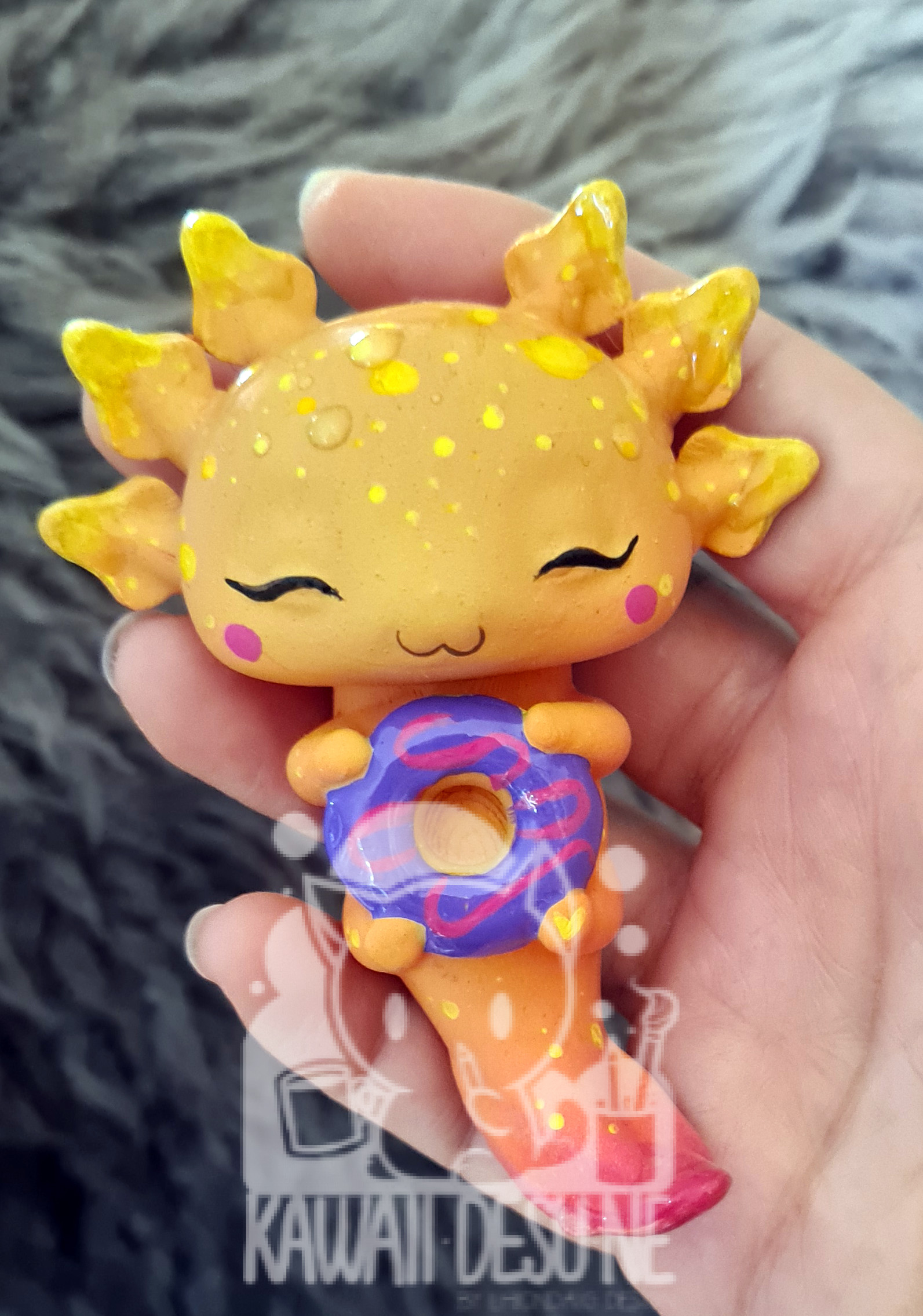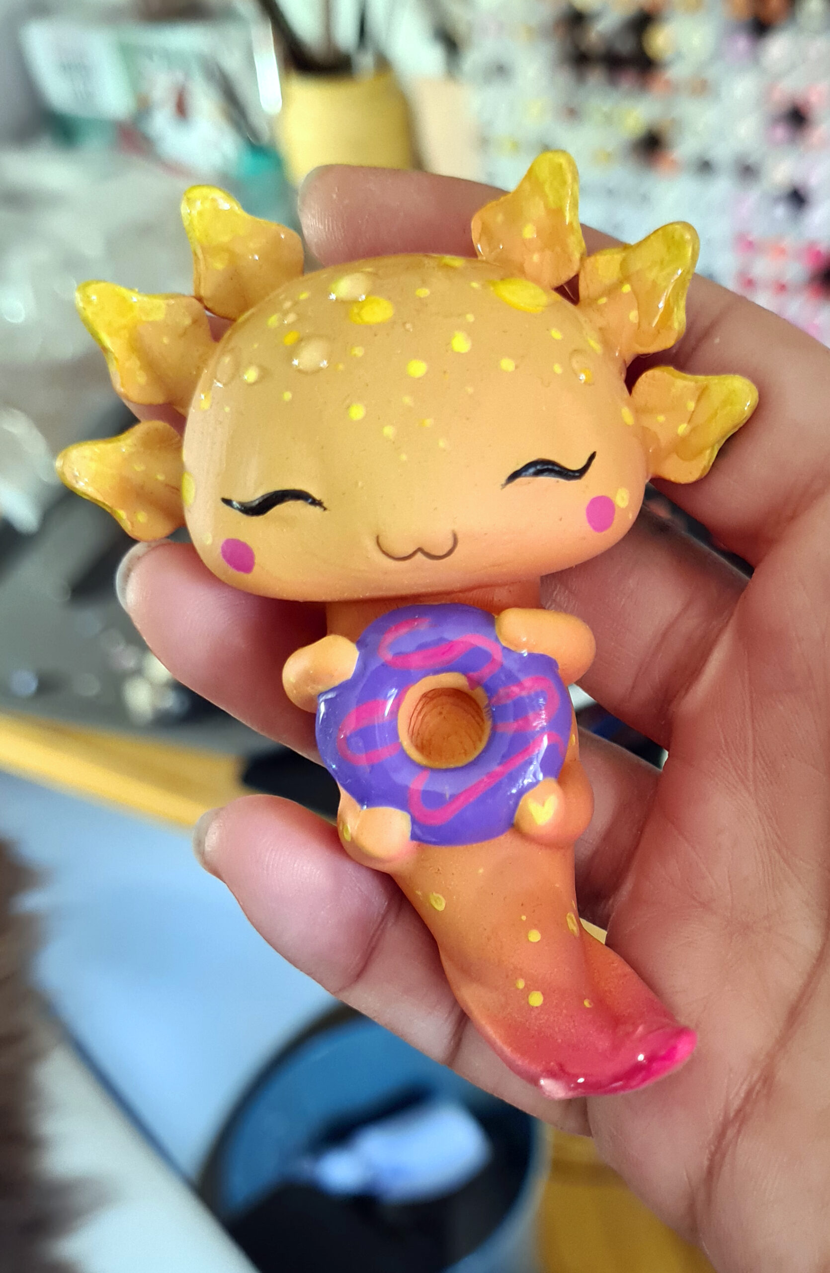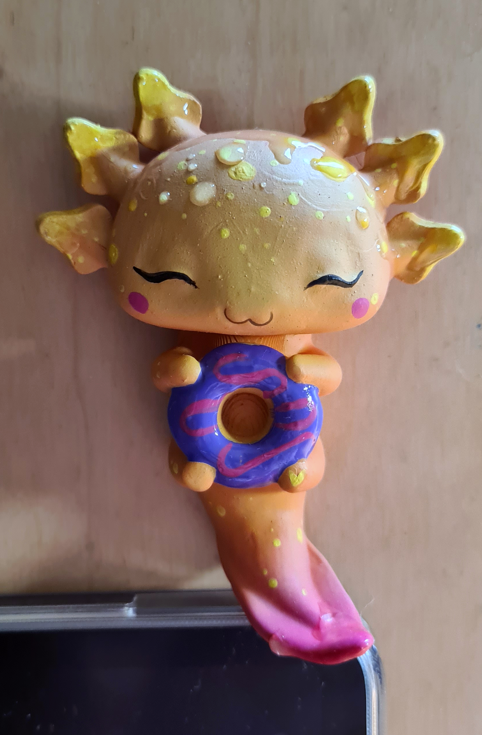 Nach dem Druck wurde jedes Axolotl einzeln per Hand mit durchsichtigem Kunstharz überzogen um oben genannte Rillen weniger sichtbar zu machen. Danach wurde es bemalt, im Anschluss mehrfach mit UV Lack geschützt(lasst es aber trotzdem nicht dauerhaft in der Sonne sitzen!) und zum Schluss wurde das „Wasser“ wieder händisch mit Kunstharz auf das Axo „getropft“.