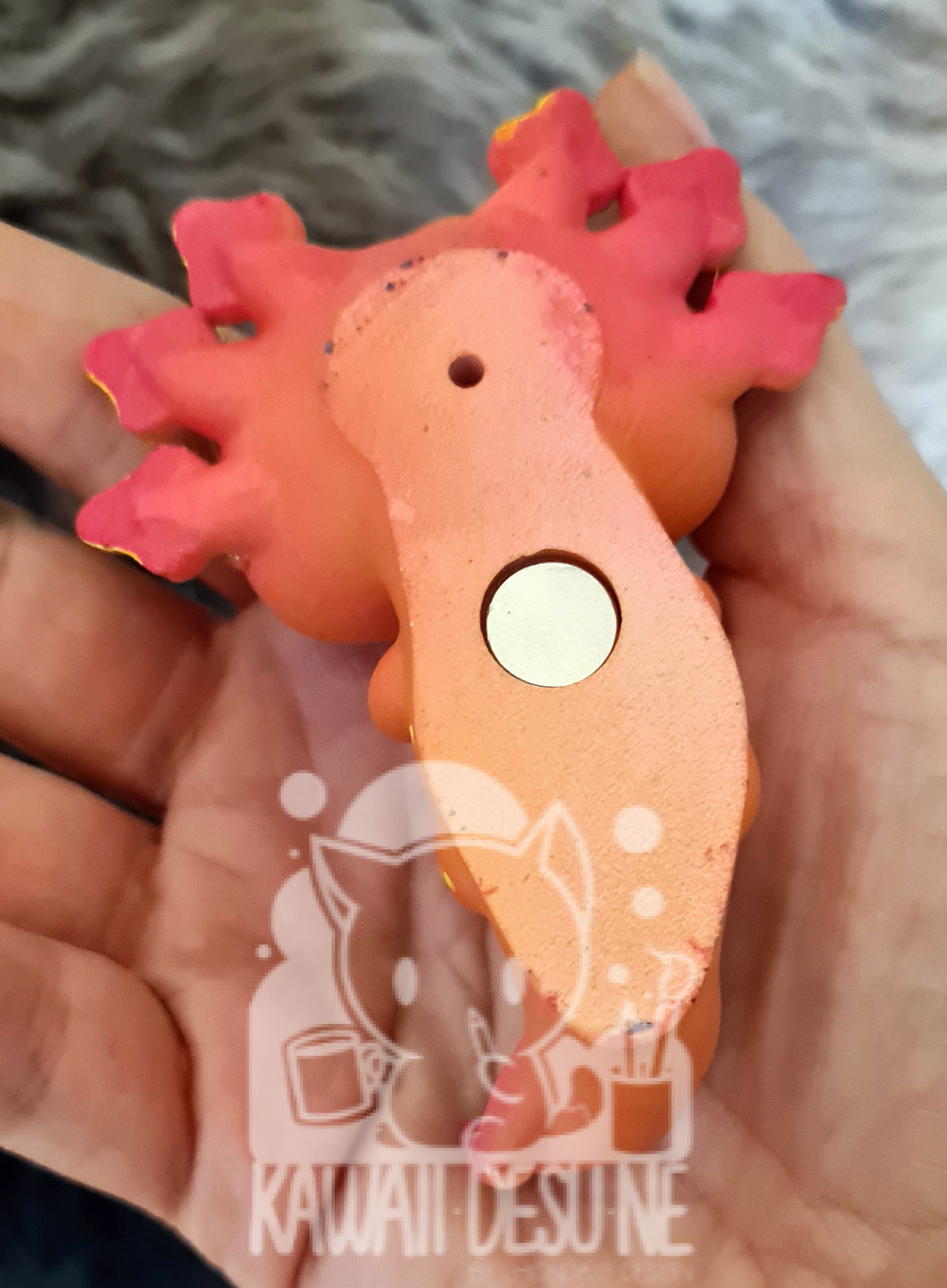 Das Axolotl ist hinten mit einem kräftigen Neodym Magnet ausgestattet, außerdem hat es noch ein Loch damit man es einfach an die Wand hängen kann!
